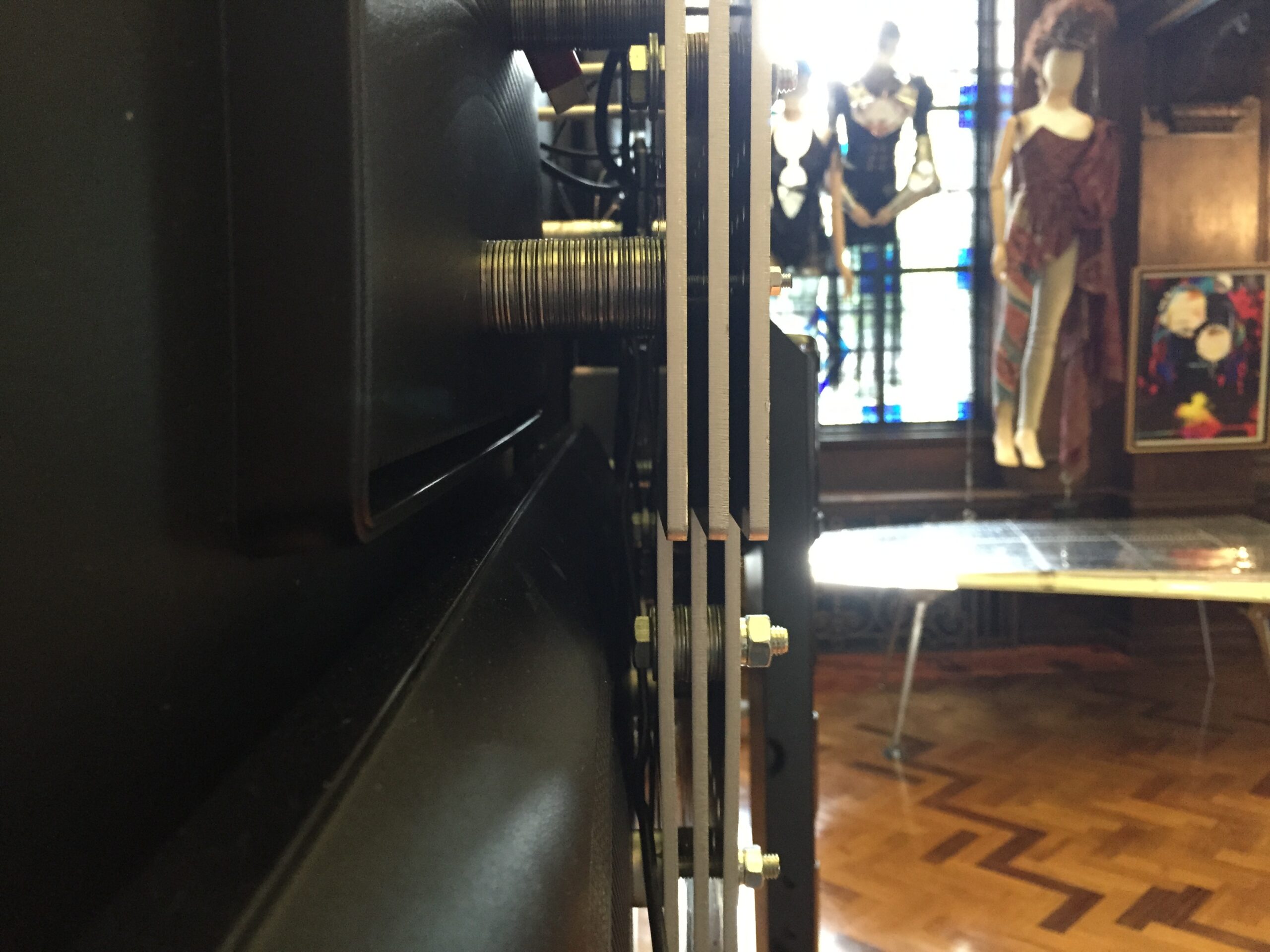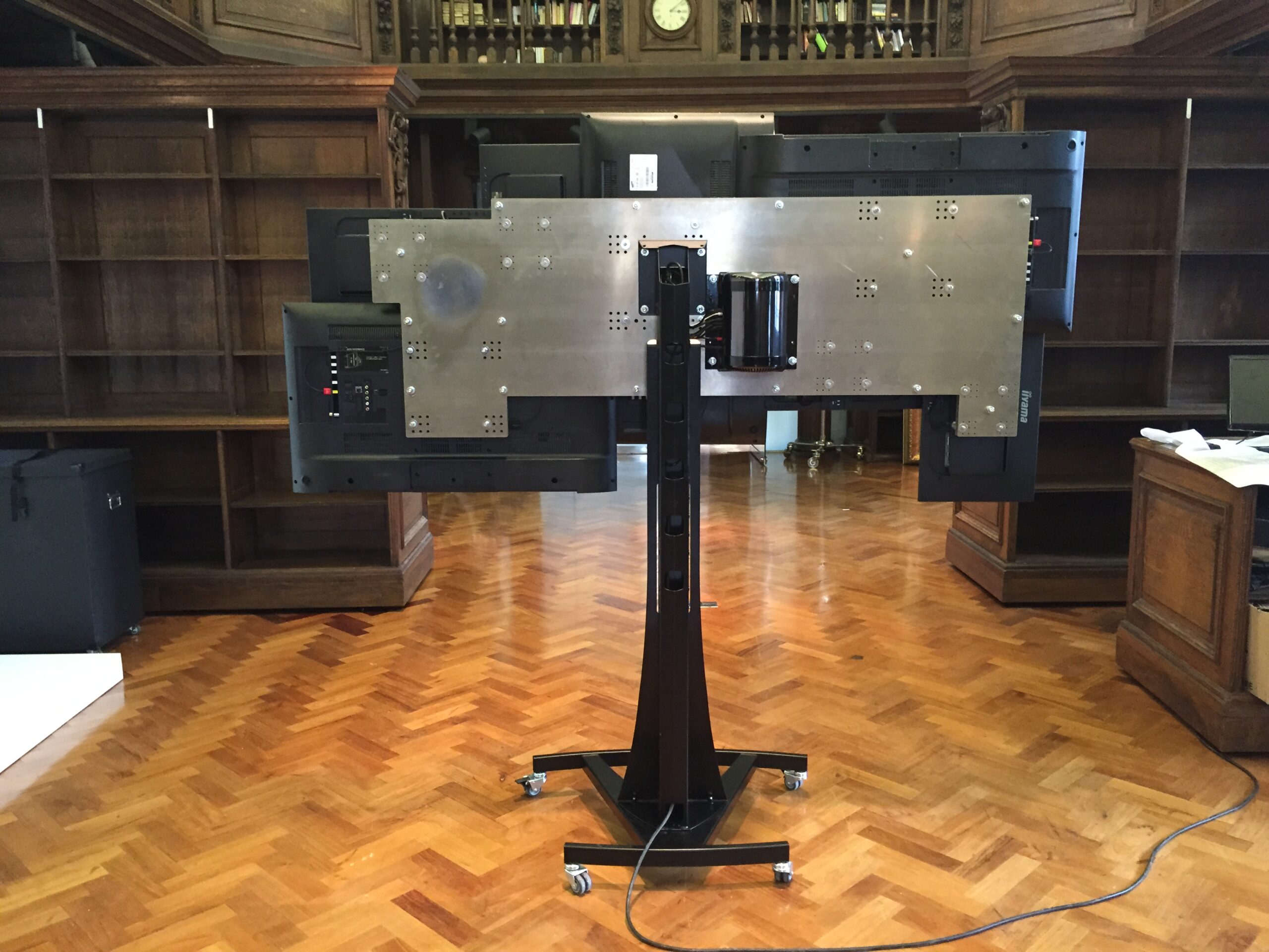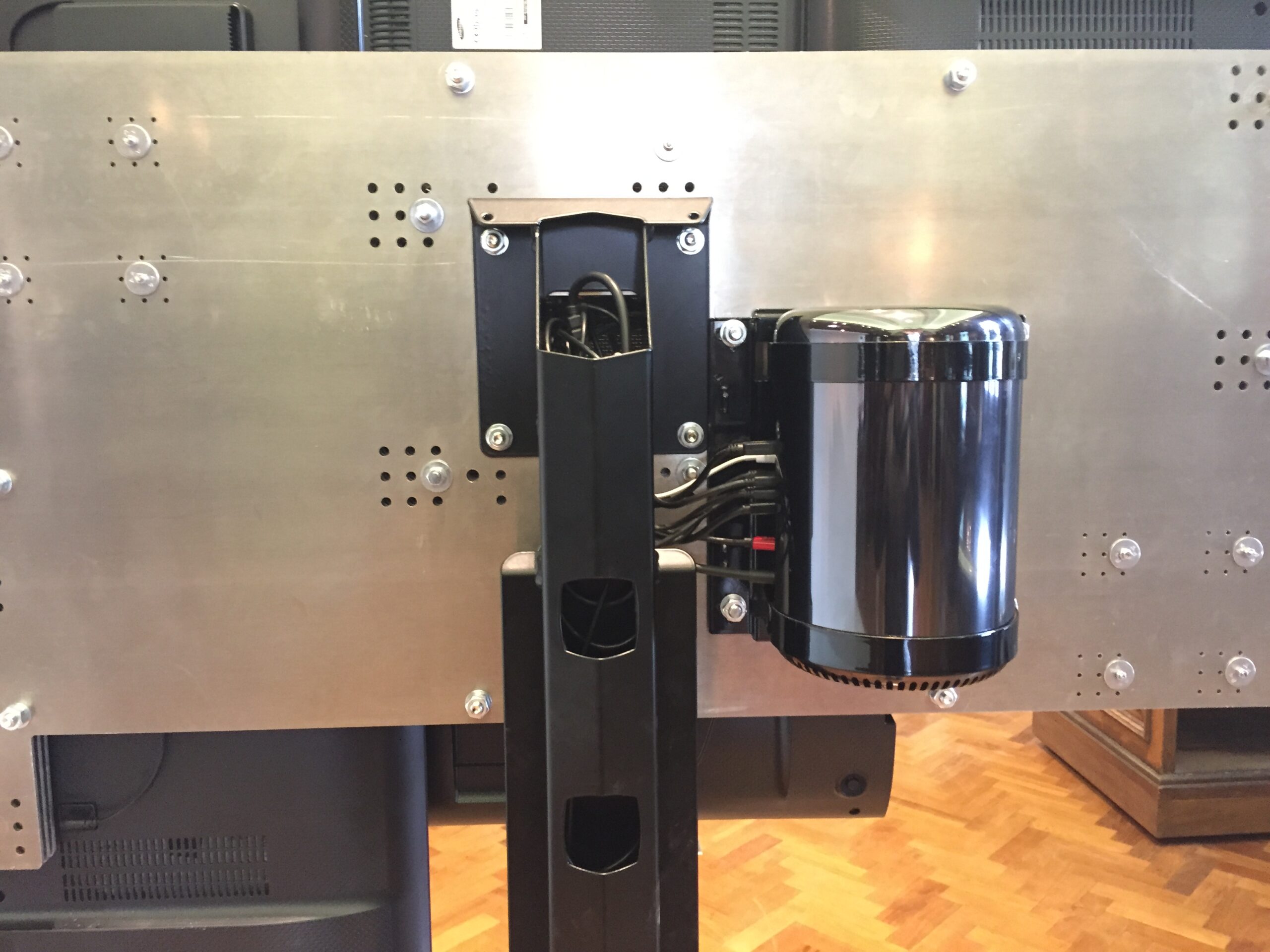 Multi screen mapped (V2) Second one commissioned by Anthony Mascolo for his private library in Battersea. Created from three CAD designed and plasma cut, 5mm thick aluminium plates. Custom Mac Pro mount and stand.